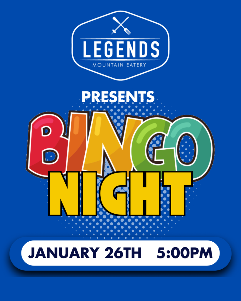 Join Legends Restaurant in the plaza for their Dinner & Bingo Night This is a fun, relaxed way to unwind after a day on the mountain. Bingo starts at 5pm - all ages are welcome to play. Dinner specials along with the Legends Menu will be available |